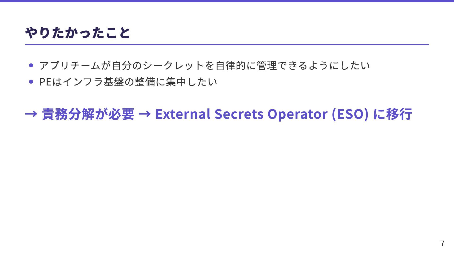 やりたかったこと アプリチームが自分のシークレットを自律的に管理できるようにしたい PEはインフラ基盤の整備に集中したい → 責務分解が必要 → External Secrets Operator (ESO)