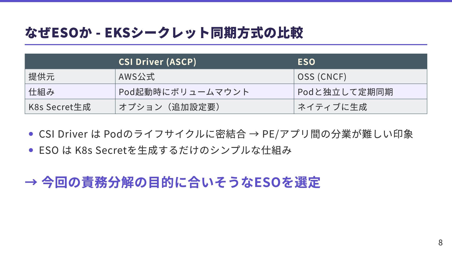 なぜESOか - EKSシークレット同期方式の比較 CSI Driver (ASCP) ESO 提供元 AWS公式 OSS