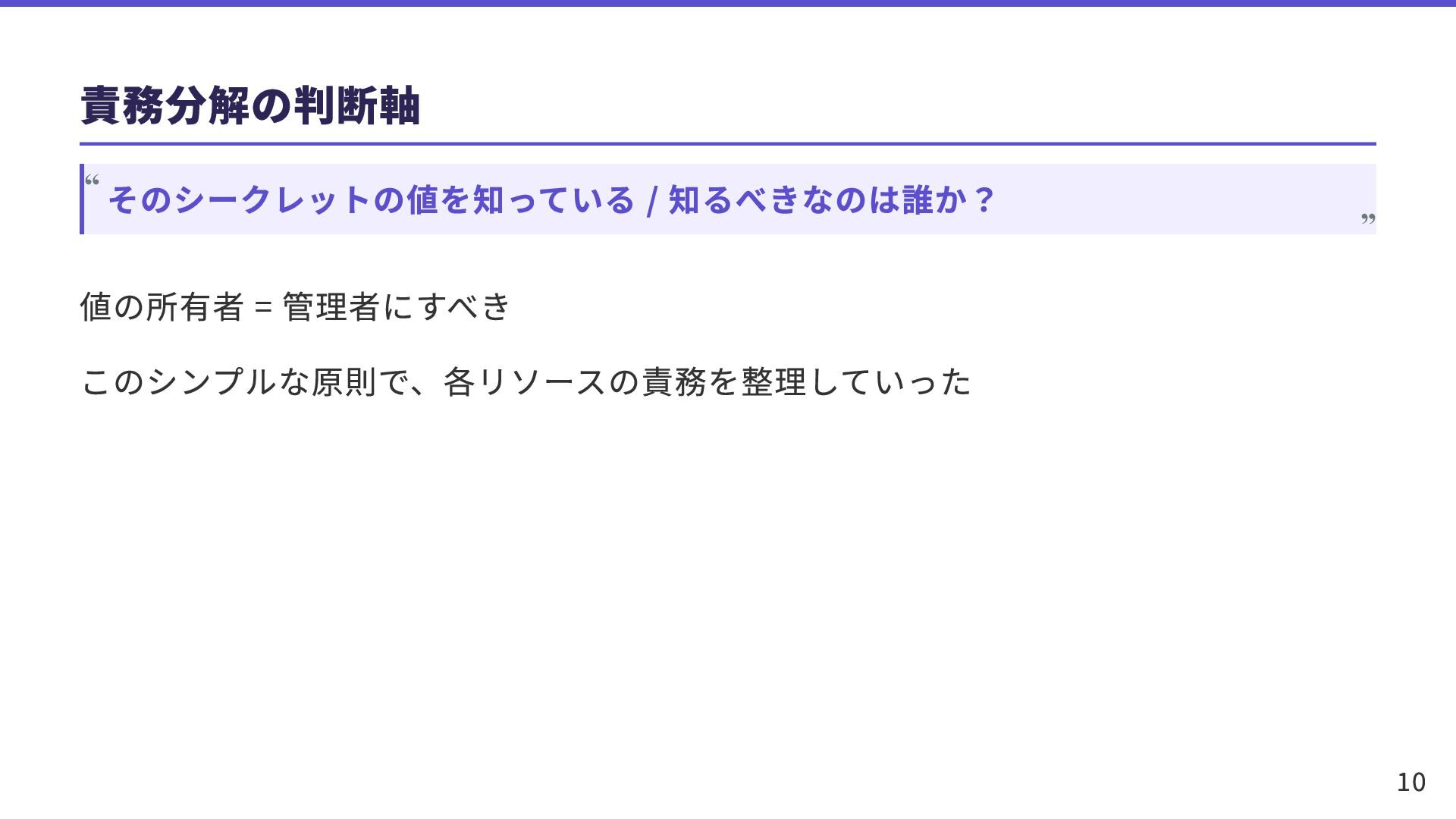 責務分解の判断軸 値の所有者 = 管理者にすべき このシンプルな原則で、各リソースの責務を整理していった そのシークレットの値を知っている / 知るべきなのは誰か? “ “