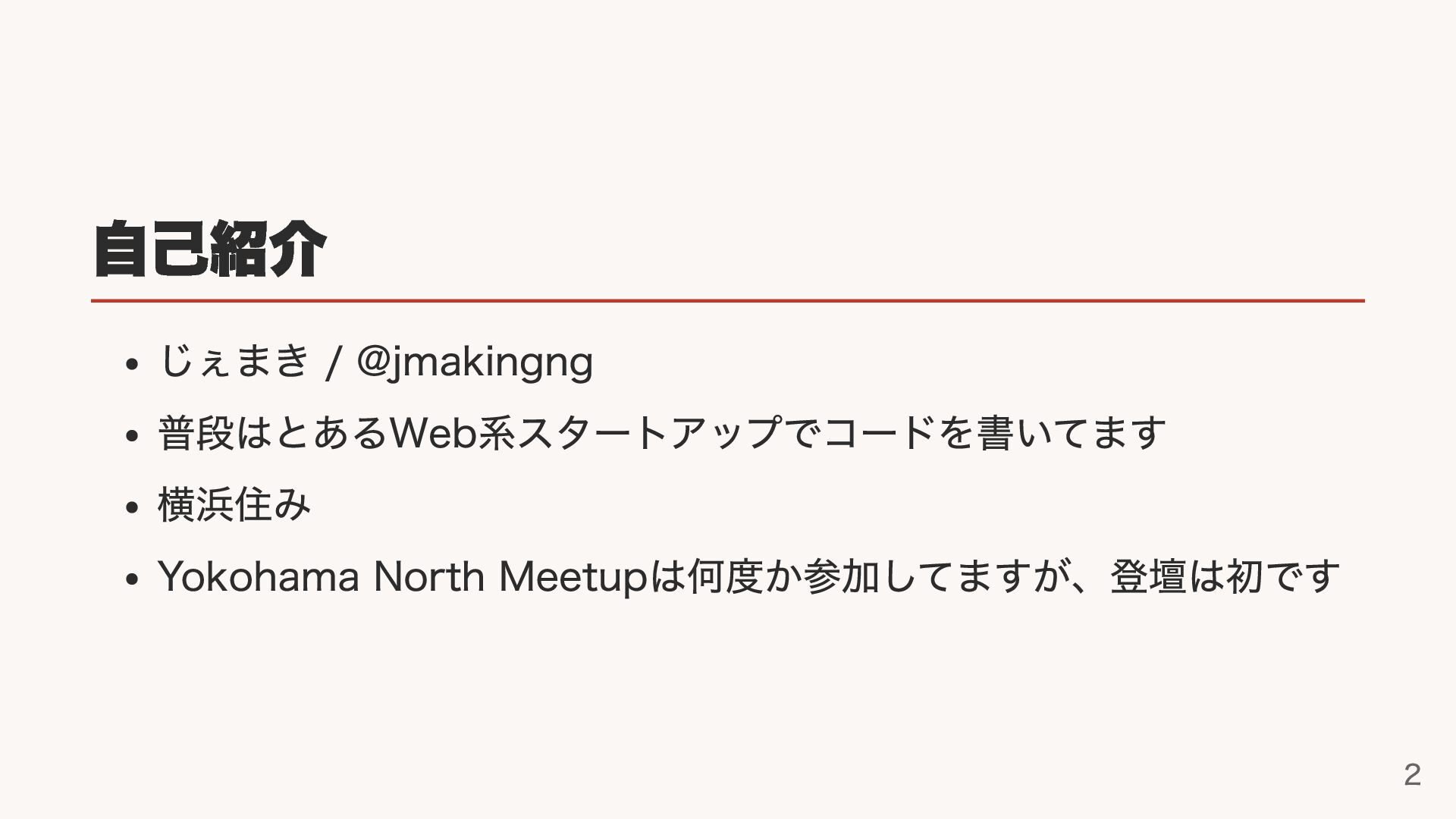自己紹介 じぇまき / @jmakingng 普段はとあるWeb系スタートアップでコードを書いてます 横浜住み Yokohama North Meetupは何度か参加してますが、登壇は初です 2