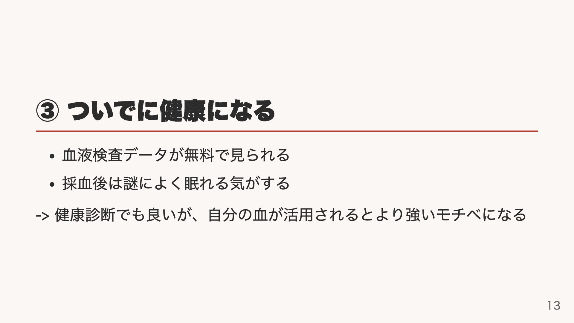 ③ ついでに健康になる 血液検査データが無料で見られる 採血後は謎によく眠れる気がする -> 健康診断でも良いが、自分の血が活用されるとより強いモチベになる 13
