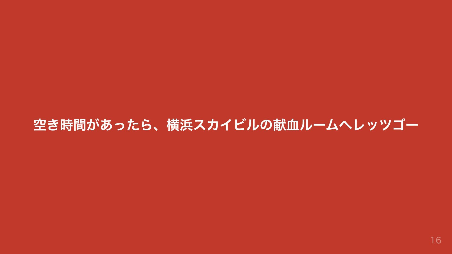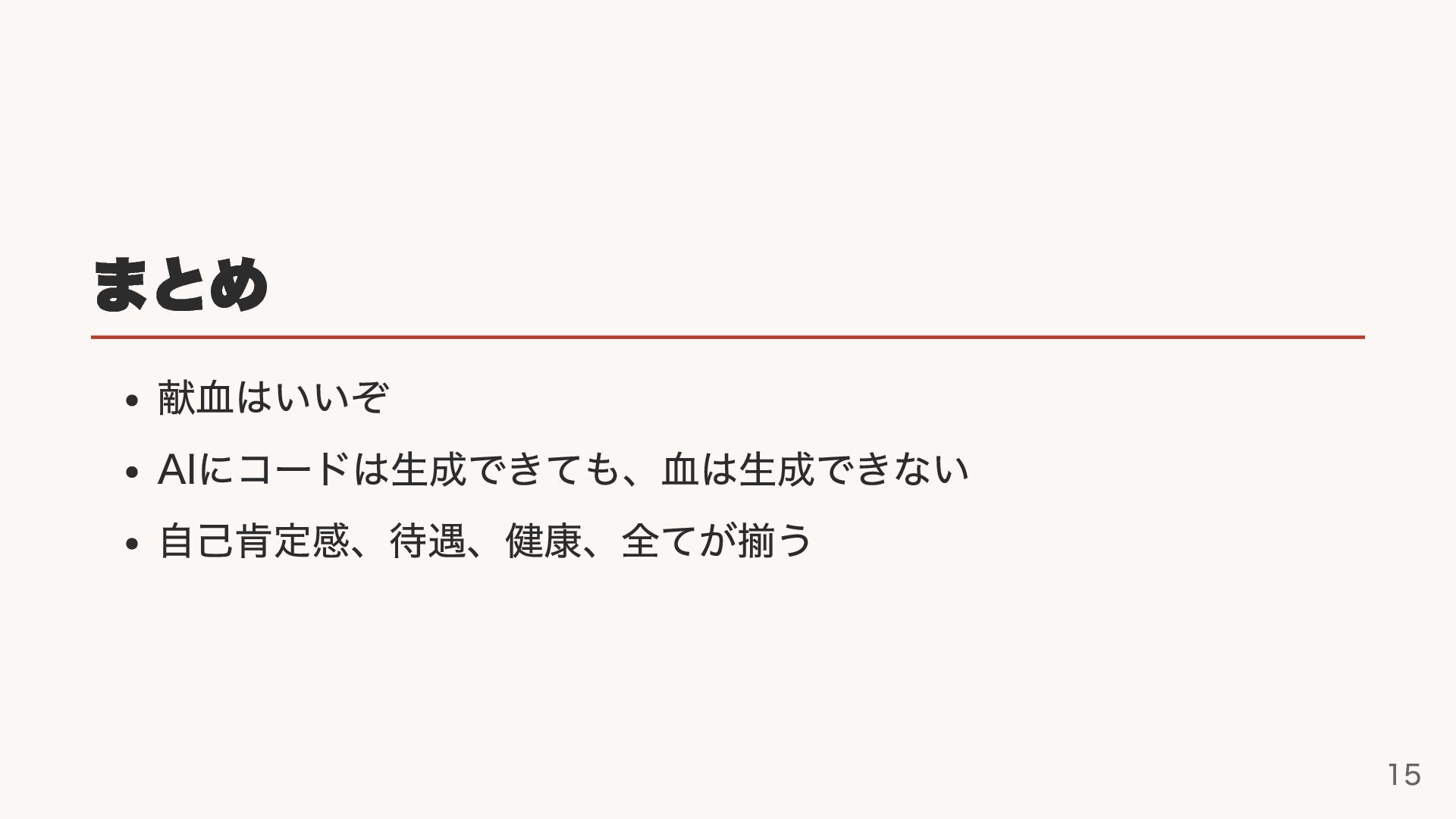 まとめ 献血はいいぞ AIにコードは生成できても、血は生成できない 自己肯定感、待遇、健康、全てが揃う 15