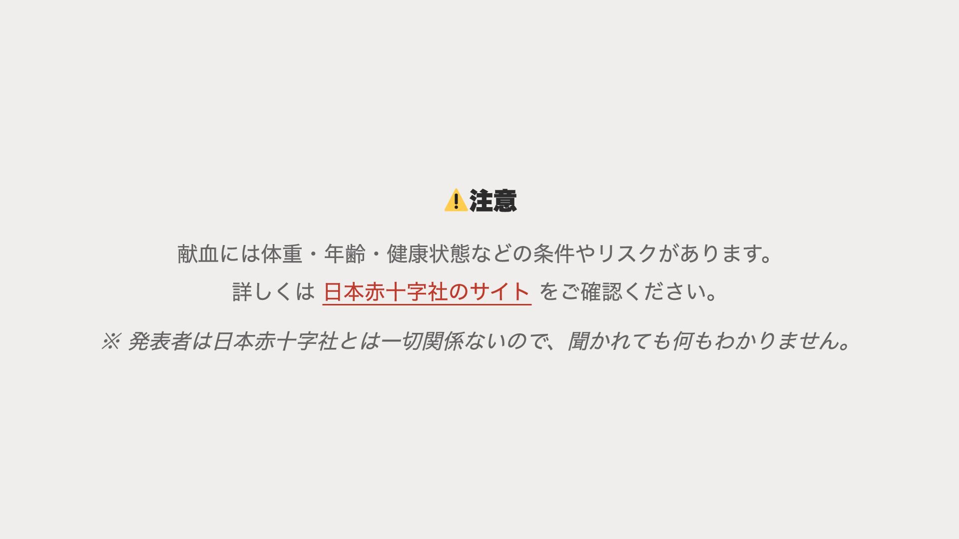注意 献血には体重・年齢・健康状態などの条件やリスクがあります。 詳しくは 日本赤十字社のサイト をご確認ください。 ※ 発表者は日本赤十字社とは一切関係ないので、聞かれても何もわかりません。