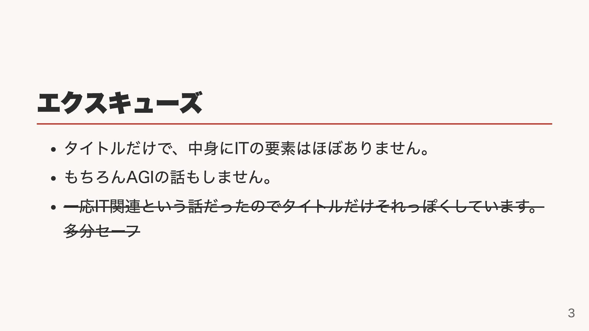 エクスキューズ タイトルだけで、中身にITの要素はほぼありません。 もちろんAGIの話もしません。 一応IT関連という話だったのでタイトルだけそれっぽくしています。 多分セーフ 3