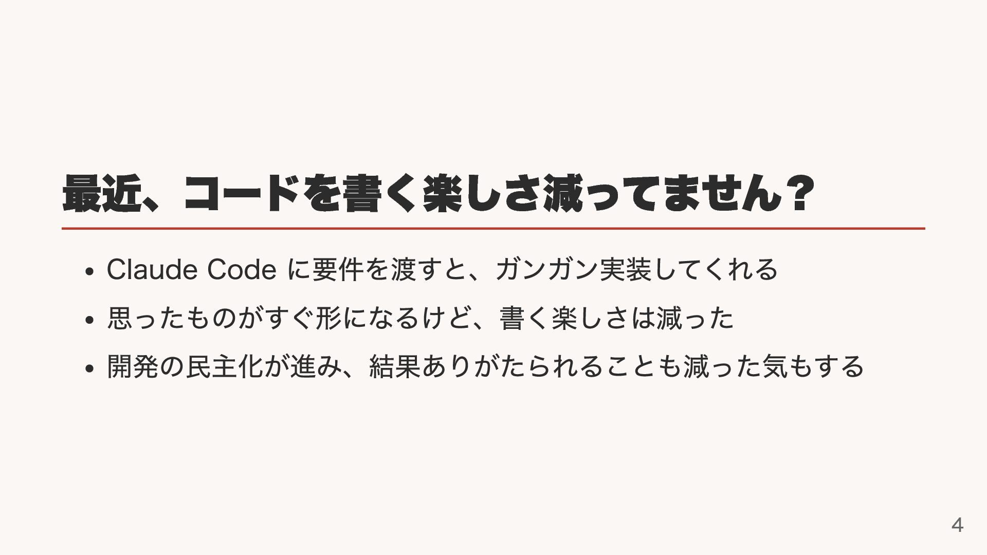 最近、コードを書く楽しさ減ってません? Claude Code に要件を渡すと、ガンガン実装してくれる 思ったものがすぐ形になるけど、書く楽しさは減った 開発の民主化が進み、結果ありがたられることも減った気もする 4