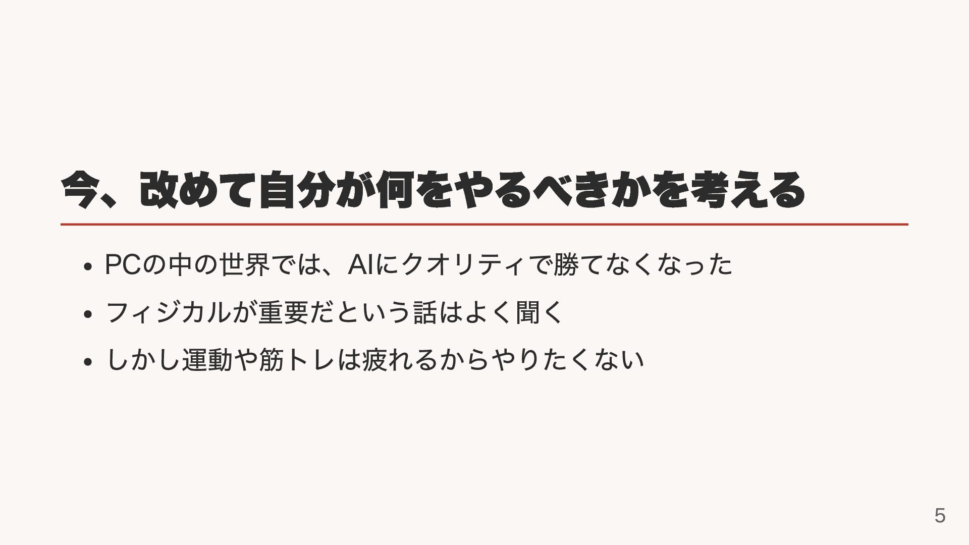 今、改めて自分が何をやるべきかを考える PCの中の世界では、AIにクオリティで勝てなくなった フィジカルが重要だという話はよく聞く しかし運動や筋トレは疲れるからやりたくない 5
