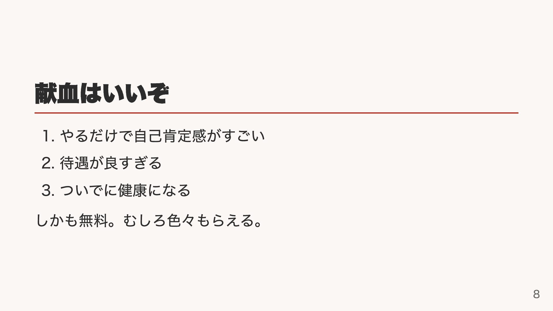 献血はいいぞ 1. やるだけで自己肯定感がすごい 2. 待遇が良すぎる 3. ついでに健康になる しかも無料。むしろ色々もらえる。 8