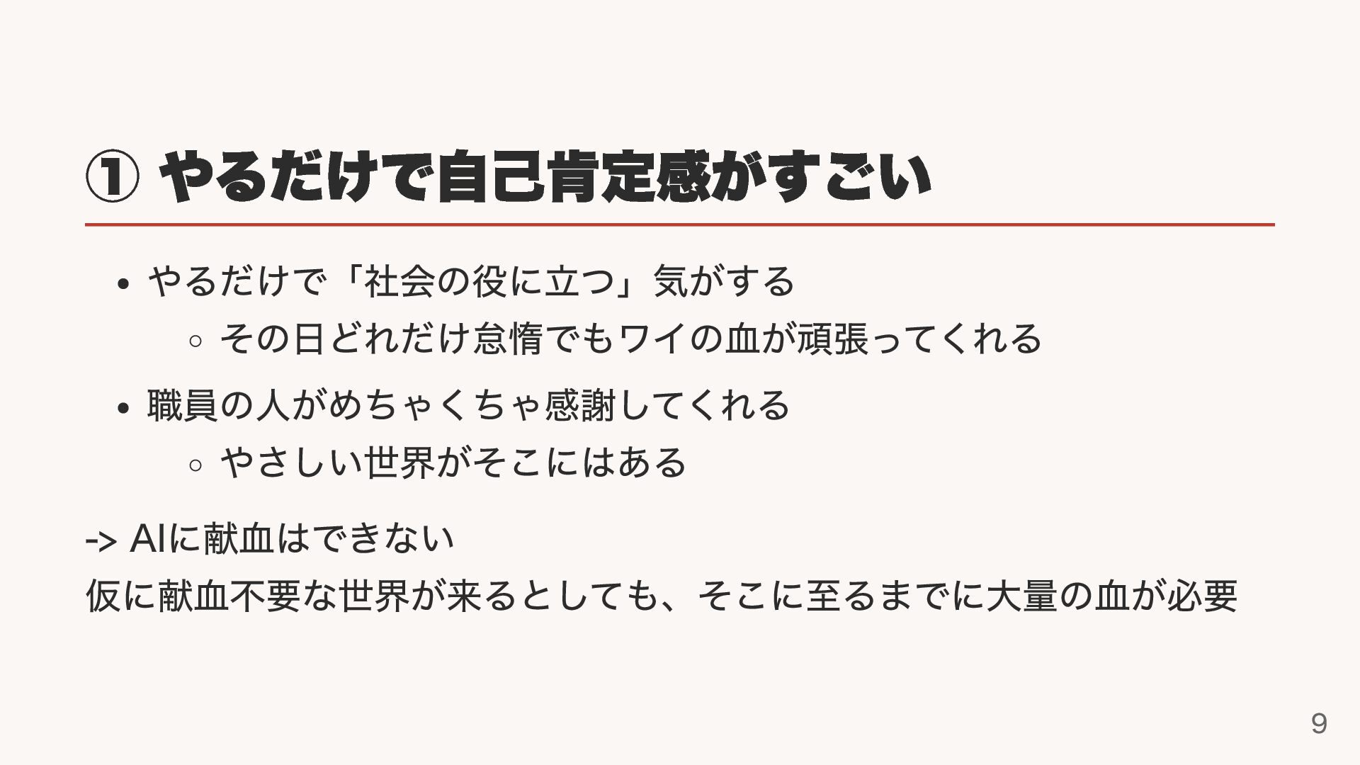 ① やるだけで自己肯定感がすごい やるだけで「社会の役に立つ」気がする その日どれだけ怠惰でもワイの血が頑張ってくれる 職員の人がめちゃくちゃ感謝してくれる やさしい世界がそこにはある -> AIに献血はできない 仮に献血不要な世界が来るとしても、そこに至るまでに大量の血が必要 9