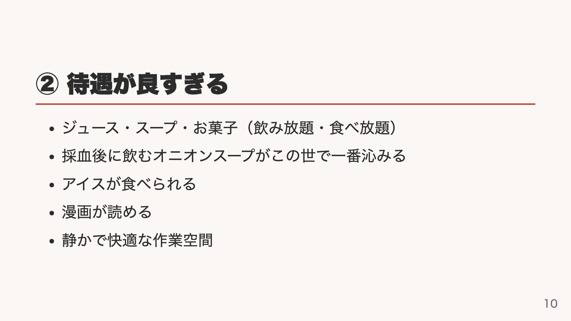 ② 待遇が良すぎる ジュース・スープ・お菓子(飲み放題・食べ放題) 採血後に飲むオニオンスープがこの世で一番沁みる アイスが食べられる 漫画が読める 静かで快適な作業空間 10