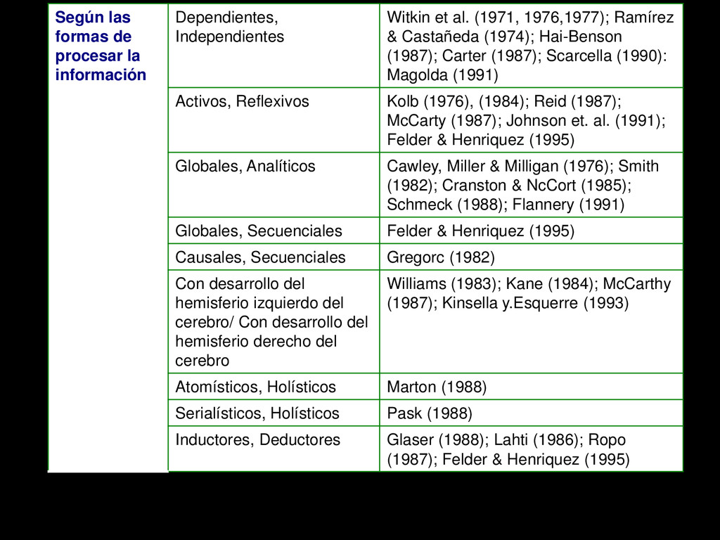 et al. (1971, 1976,1977); Ramírez & Castañeda (1974); Hai-Benson (1987); Carter (1987); Scarcella (1990): Magolda (1991) Activos, Reflexivos Kolb (1976), (1984); Reid (1987); McCarty (1987); Johnson et. al. (1991); Felder & Henriquez (1995) Globales, Analíticos Cawley, Miller & Milligan (1976); Smith (1982); Cranston & NcCort (1985); Schmeck (1988); Flannery (1991) Globales, Secuenciales Felder & Henriquez (1995) Causales, Secuenciales Gregorc (1982) Con desarrollo del hemisferio izquierdo del cerebro/ Con desarrollo del hemisferio derecho del cerebro Williams (1983); Kane (1984); McCarthy (1987); Kinsella y.Esquerre (1993) Atomísticos, Holísticos Marton (1988) Serialísticos, Holísticos Pask (1988) Inductores, Deductores Glaser (1988); Lahti (1986); Ropo (1987); Felder & Henriquez (1995)