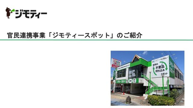 その中でも、7自治体(8店舗)とは共同で官民共同のリユーススポット・ジモティースポットを出店し、 • 「使えるもの」をゴミにせず、リユースすることで収益化を行えるシステムを構築 自治体との提携実績 行政との提携ステップ リユースの啓発から共同でのリユースモデルの 構築まで各行政のニーズに合わせて検証を実施 パターン3:官民共同リユース パターン2:自治体回収品のリユース パターン1:リユースの啓発 自治体が回収したモノのうち一部 の再利用が可能な商品をジモティ ーに掲載し譲渡先を探す 自治体の冊子やWEBサイトでジモテ ィーを紹介。自治体に回収を依頼する 前に自ら譲渡先を探してもらう より多くの回収品をジモティ ーを通して住民に譲渡できる スキームを共同で構築 提携数 194 ※2024年11月1日現在 提携自治体 (事例)ジモスポ出店先 世田谷区、日野市、八王子市 品川区、川崎市 愛知県(名古屋市・小牧市) 山口県光市 (事例)ジモスポ出店のリード 札幌市、福島市、さいたま市 千葉市、静岡市、津市 京都市、大阪市、神戸市 高松市、宮崎市など多数
