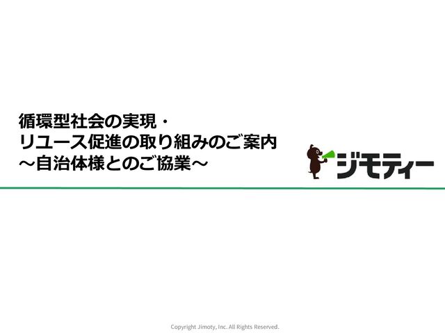 掲載 閲覧 引き取り 譲渡できなかったモノ 官民連携スポット ジモティー 粗大ごみとして捨てようと考えている住民からまだ使えるモノを収集し、リユースする協働の取り組み。 自治体様と共同運営のリユーススポットを開設させていただきます。 月間1,000万人が利用するジモティーのリーチ力と効率的な運営ノウハウで大幅な粗大ごみの削減を実現。 粗大ごみ 申し込みペ ージ × ごみ減量 廃棄処理 自治体様 ・スポットの運営 ・地域のスタッフ の雇用・育成 ・市民への周知 ・譲渡できなかったモノ の処理 休眠施設や リユース施設の一部 スタッフ (地域住民) リユース品の 持ち込み 取り組み事例 ③ごみ減量事業(官民連携のリユーススポット開設) 東京都【世田谷区】の事例 世田谷区様実績 月間2,000品以上のリユース、10トン以上のごみ減量効果