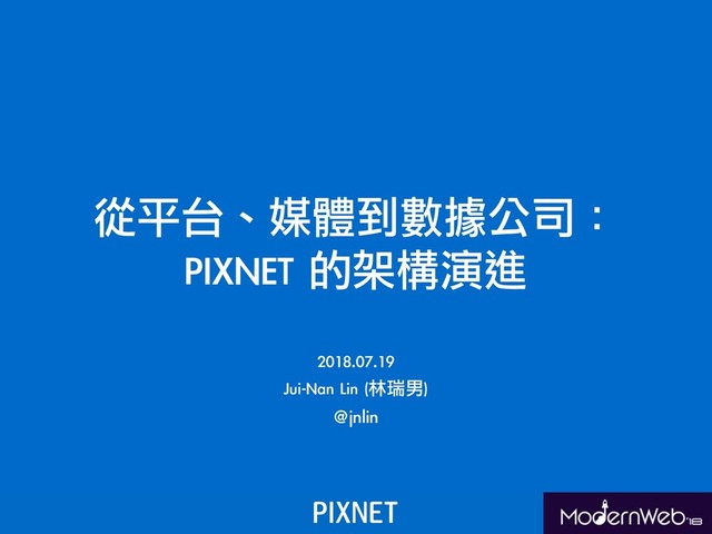 ㄇ 2018.07.19 Jui-Nan Lin (林瑞男) @jnlin 從平台、媒體到數據公司: PIXNET 的架構演進