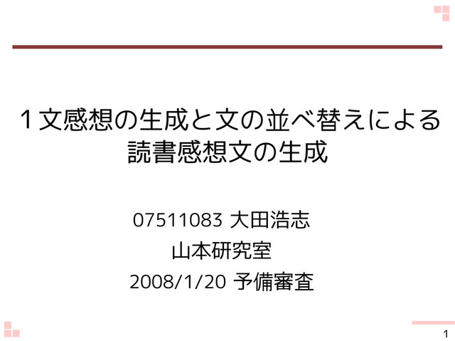 1文感想の生成と文の並べ替えによる 読書感想文の生成 07511083 大田浩志 山本研究室 2008/1/20 予備審査 1