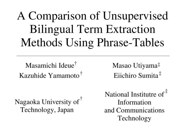 Masamichi Ideue† Kazuhide Yamamoto Masao Utiyama Eiichiro Sumita ‡ Nagaoka University of Technology, Japan † National Institutre of Information and Communications Technology † ‡ ‡