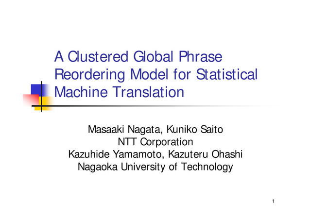 Masaaki Nagata, Kuniko Saito, Kazuhide Yamamoto and Kazuteru Ohashi. Clustered Global Phrase Reordering Model for Statistical Machine Translation. Proceedings of 21st International Conference on Computational Linguistics and 44th Annual Meeting of the Association for Computational Linguistics (COLING-ACL 2006), pp.713-720 (2006.7)