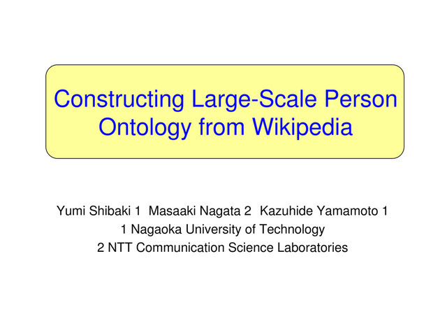 Yumi Shibaki, Masaaki Nagata and Kazuhide Yamamoto. Constructing Large-Scale Person Ontology from Wikipedia. Proceedings of 2nd Workshop on The People’s Web Meets NLP: Collaboratively Constructed Semantic Resources ( CCSR 2010), pp.1-9 (2010.8)