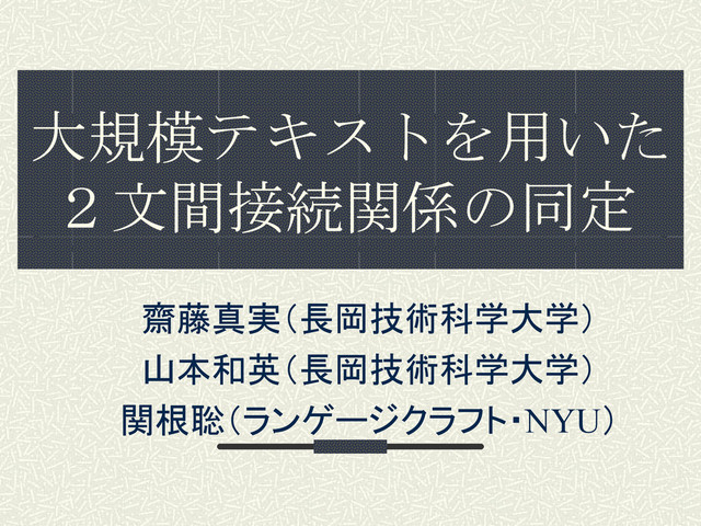 大規模テキストを用いた 2文間接続関係の同定 齋藤真実(長岡技術科学大学) 山本和英(長岡技術科学大学) 関根聡(ランゲージクラフト・NYU)