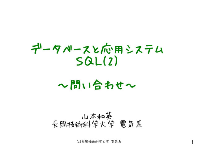 年齢 ASC 昇順でソート SELECT * FROM 社員 ORDER BY 年齢 ASCは省略可能 SELECT * FROM 社員 ORDER BY 年齢, 社員番号 年齢が同じ場合、社員番号でさらにソートする SELECT 受注ID, SUM(数量) FROM 社員 ORDER BY 2 ASC 数字を指定するとSELECT中の項目番号を指す。 この場合は ORDER BY SUM(数量) ASC と同じ意味