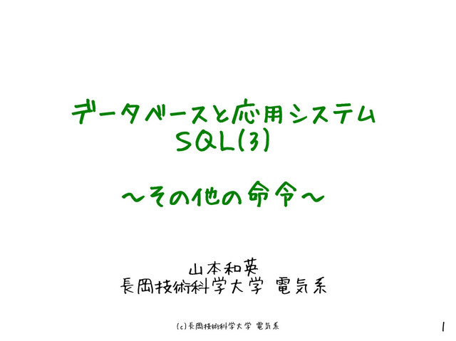 会社ID, 社名 FROM 得意先 CREATE VIEW 県内企業 AS SELECT * FROM 得意先 WHERE 住所 LIKE '新潟県%' CREATE VIEW 受注(受注ID,日付,社名) AS SELECT X.受注ID, X.日付, Y.得意先 FROM 伝票 X, 得意先 Y WHERE X.得意先ID = Y.得意先ID