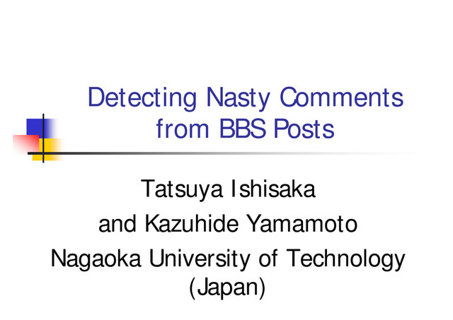 Tatsuya Ishisaka and Kazuhide Yamamoto. Detecting Nasty Comments from BBS Posts. Proceedings of The 24th Pacific Asia Conference on Language, Information and Computation (PACLIC 24), pp.645-652 (2010.11)