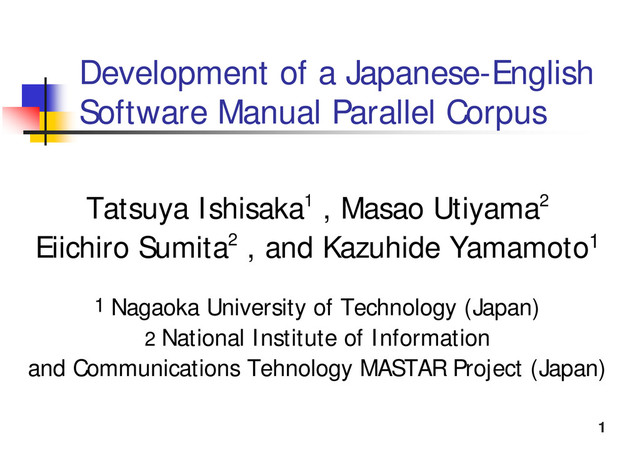 Ishisaka1 , Masao Utiyama2 Eiichiro Sumita2 , and Kazuhide Yamamoto1 1 Nagaoka University of Technology (Japan) 2 National Institute of Information and Communications Tehnology MASTAR Project (Japan)
