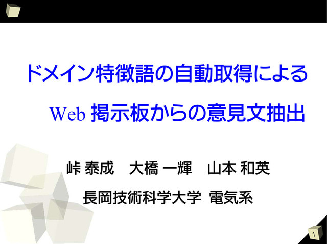 4 0.789 快適 10 2 0.833 家族 2 25 0.074 電話 4 9 0.307 単語スコアの算出 W s w i = P p w i P p w i P n w i P p : 意見文で単語 W i が出現する確率 P n : 意見文以外で単語 W i が出現する確率 ➔ では、意見文か否かの情報のない掲示板文書 からどのように情報を判断するべきか?