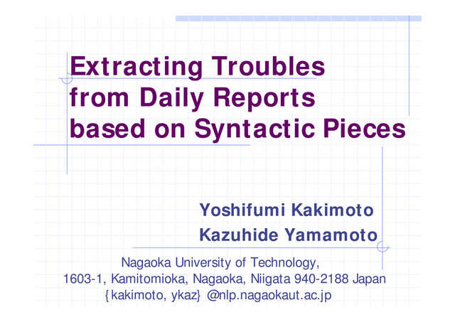 Yoshifumi Kakimoto and Kazuhide Yamamoto. Extracting Troubles from Daily Reports based on Syntactic Pieces. Proceedings of the Annual meetings of the Pacific Asia Conference on Language, Information and Computation (PACLIC 22), pp.411-417 (2008.11)