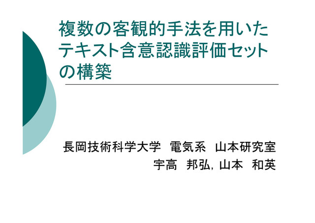 複数の客観的手法を用いた テキスト含意認識評価セット の構築 長岡技術科学大学 電気系 山本研究室 宇高 邦弘,山本 和英
