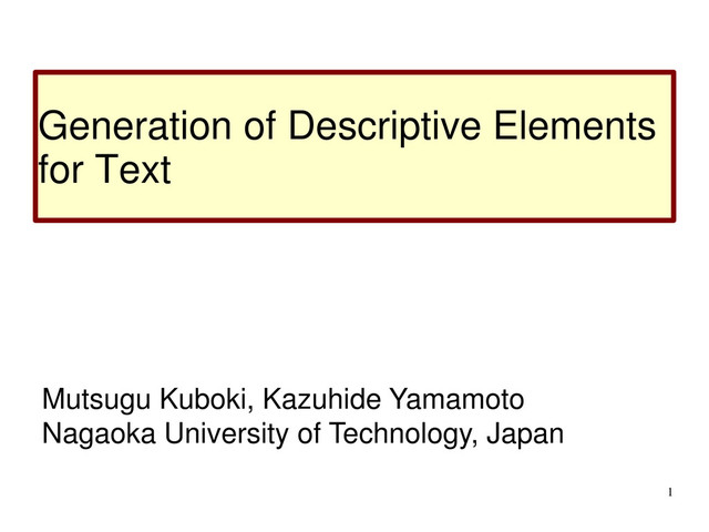 Mutsugu Kuboki and Kazuhide Yamamoto. Generation of Descriptive Elements for Text. Proceedings of 7th International Conference on Natural Language Processing and Knowledge Engineering (NLPKE 2011), pp.56-59 (2011.11)