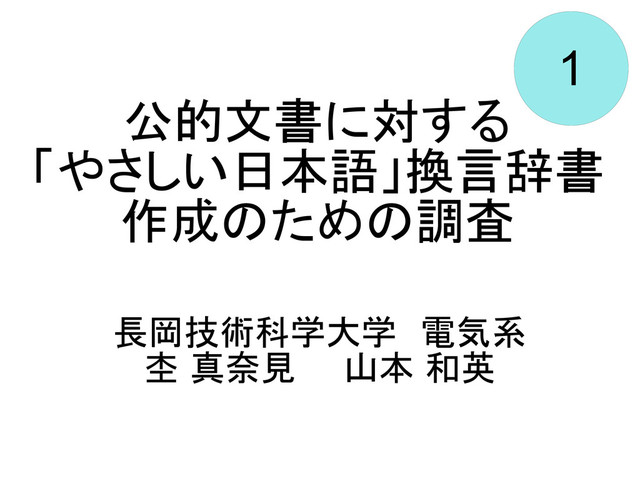 公的文書に対する 「やさしい日本語」換言辞書 作成のための調査 長岡技術科学大学 電気系 杢 真奈見 山本 和英 1