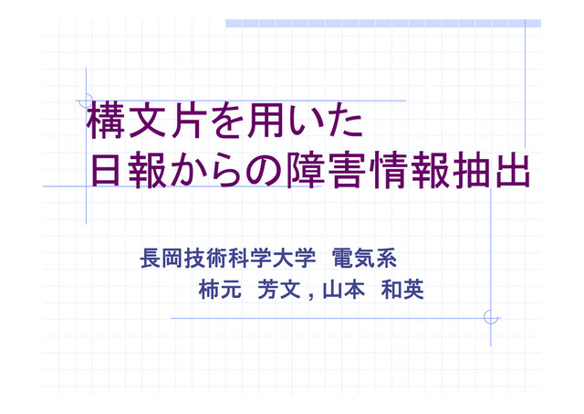 構文片を用いた 日報からの障害情報抽出 長岡技術科学大学 電気系 柿元 芳文 , 山本 和英