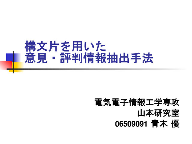 i ⊂ S score piece i piece i S . は文 から抽出した構文片 sentence scoreS S . は文 の極性を示すスコア {sentence scoreS0 好評文 sentence scoreS0 不評文 otherwise その他 }