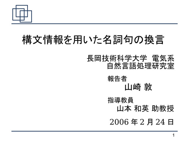 1 構文情報を用いた名詞句の換言 長岡技術科学大学 電気系 自然言語処理研究室 山崎 敦 山本 和英 助教授