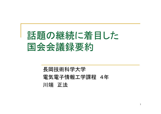 1 話題の継続に着目した 国会会議録要約 長岡技術科学大学 電気電子情報工学課程 4年 川端 正法