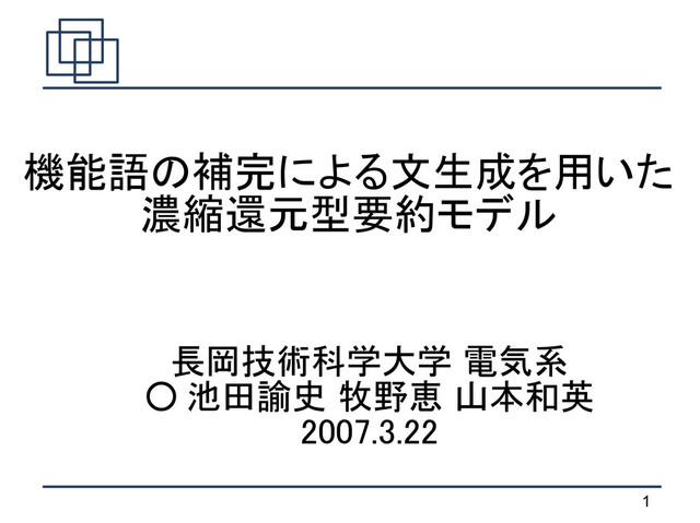 を抽出単語列 – ラベル列 y を補完する機能語列 水 は 生命 の 源 だ x y argmax y ∈∑ y T ∏ t =1 T P x t ∣y t P y t ∣y t −1 T :ラベル数 P x t ∣y t :出力確率 2gram 後方からの 確率 P y t ∣y t −1 :遷移確率 2gram 機能語の 確率