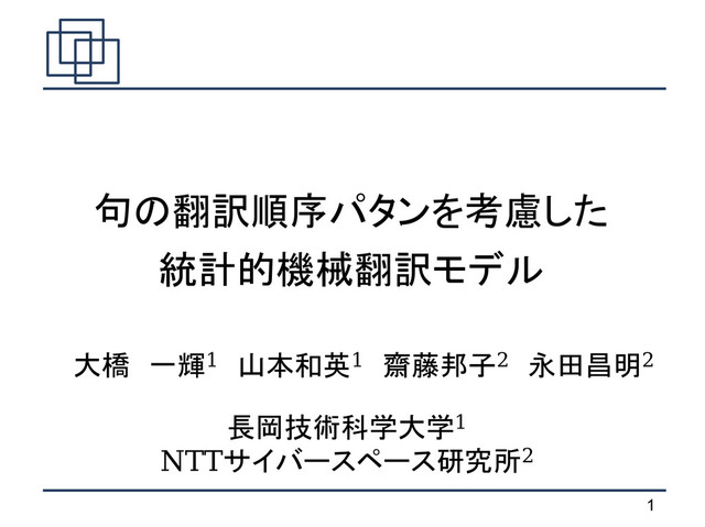is a means commu- nication of 言語 は コミュニ ケーション の 道具 で ある language is a means commu- nication of 日英方向の対応付け 英日方向の対応付け (言語,language) (の,of) (コミュニケーション,communication) (の道具, a means of) (コミュニケーションの, of communication) (言語は, language is) (コミュニケーションの道具, a means of communication) 積集合 和集合 言語 は コミュニ ケーション の 道具 で ある language is a means commu- nication of (の道具である, a means of)
