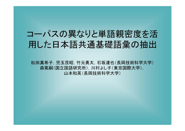 松田 真希子, 児玉 茂昭, 竹元 勇太, 石坂 達也, 森 篤嗣, 川村 よし子, 山本 和英. コーパスの異なりと単語親密度を活用した日本語共通基礎語彙の抽出. 言語処理学会第16回年次大会, pp.579-582 (2010.3)
