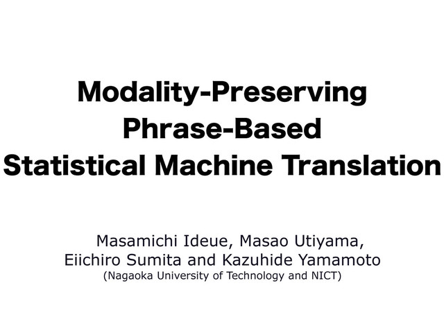 Masamichi Ideue, Masao Utiyama, Eiichiro Sumita and Kazuhide Yamamoto. Modality-Preserving Phrase-Based Statistical Machine Translation. Proceedings of the International Conference on Asian Language Processing (IALP 2012), pp.129-132 (2012.11)