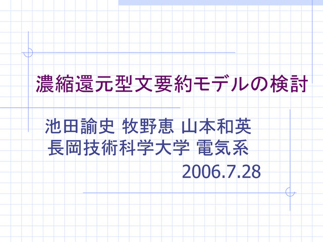 濃縮還元型文要約モデルの検討 池田諭史 牧野恵 山本和英 長岡技術科学大学 電気系 2006.7.28