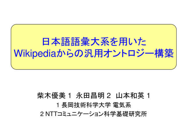 柴木 優美, 永田 昌明, 山本 和英. 日本語語彙大系を用いたWikipediaからの汎用オントロジー構築. 情報処理学会 研究報告, NL194-4 (2009.11)