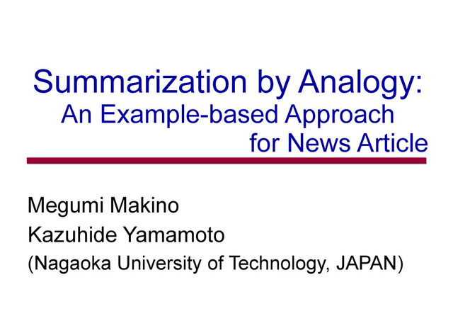 Megumi Makino and Kazuhide Yamamoto. Summarization by Analogy: An Example-based Approach for News Articles. Proceedings of The Third International Joint Conference on Natural Language Processing (IJCNLP2008), pp.739-744 (2008.1)