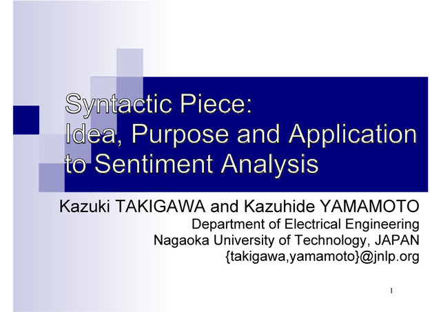 Kazuki Takigawa and Kazuhide Yamamoto. Syntactic Piece:Idea, Purpose and Application to Sentiment Analysis. Proceedings of 7th International Conference on Natural Language Processing and Knowledge Engineering (NLPKE 2011), pp.401-404 (2011.11)
