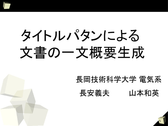 Machine(SVM) による学習 →タイトルに含まれやすい名詞を学習 ・ IDF による得点付け →一般的な名詞の排除 Score(W i ) = Rank SVM (W i ) 1 Rank IDF (W i ) 1 + W i : 名詞 Rank SVM (W i ):SVM による W i の順位 Rank IDF (W i ): 単語の頻度情報による W i の順位