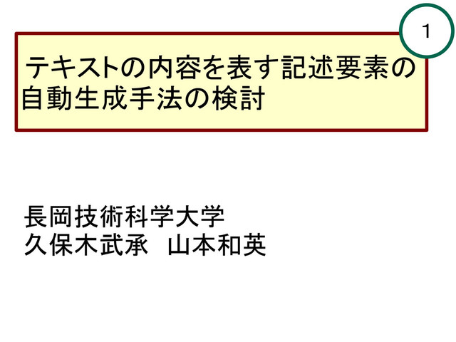 長岡技術科学大学 久保木武承 山本和英 テキストの内容を表す記述要素の 自動生成手法の検討 1