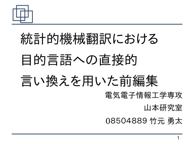 a slip of the tongue. 同言語内前編集: ~であると言っても壮語ではない。 翻訳結果: not that it was not a big talk. 参照訳: It may be no exaggeration to say that. • 過言と壮語はexaggerationに翻訳されるべき • 既存手法では、必ずしも目的の語に翻訳されない 同言語内前編集の問題例 × ×