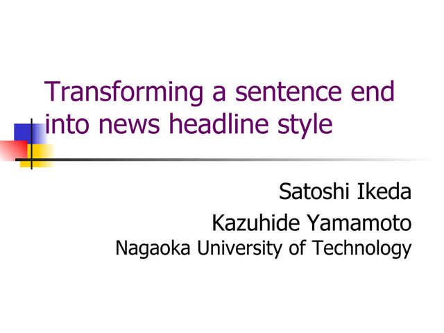 Satoshi Ikeda and Kazuhide Yamamoto. Transforming a Sentence End into News Headline Style. Proceedings of The Third International Workshop on Paraphrasing (IWP2005), pp.41-48 (2005.10)