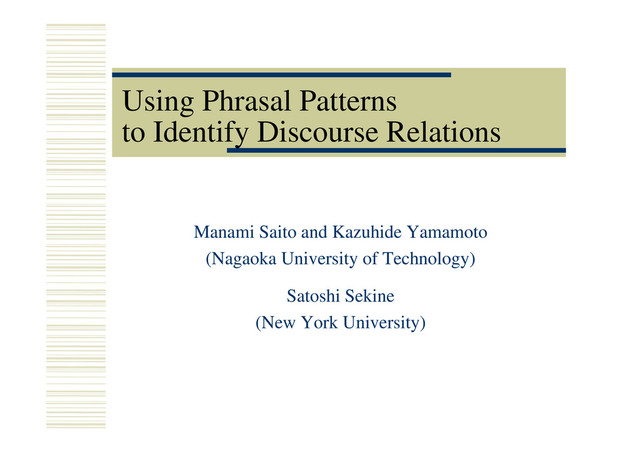 Manami Saito, Kazuhide Yamamoto and Satoshi Sekine. Using Phrasal Patterns to Identify Discourse Relations. Proceedings of Human Language Technology conference - North American chapter of the Association for Computational Linguistics annual meeting (HLT-NAACL 2006), Companion Volume, pp.133-136 (2006.6)
