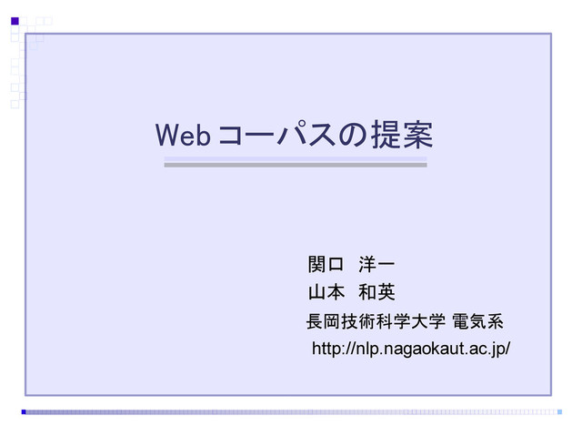 Web コーパスの提案 長岡技術科学大学 電気系 関口 洋一 山本 和英 http://nlp.nagaokaut.ac.jp/