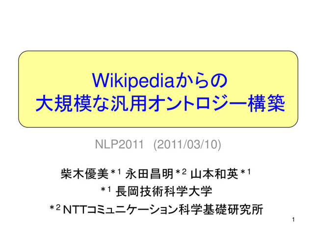 柴木 優美, 永田 昌明, 山本 和英. Wikipediaからの大規模な汎用オントロジー構築. 言語処理学会第17回年次大会, pp.908-911 (2011.3)
